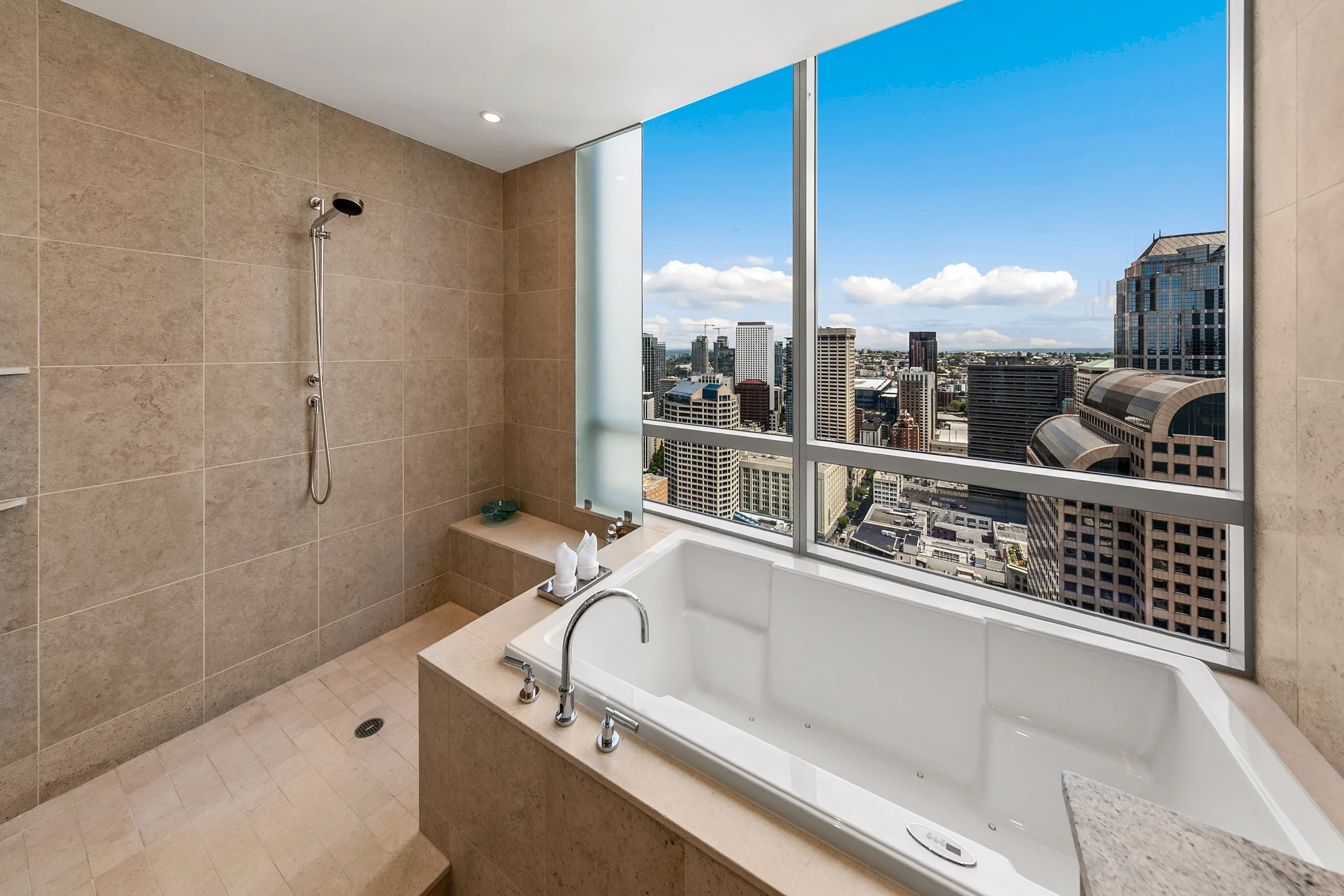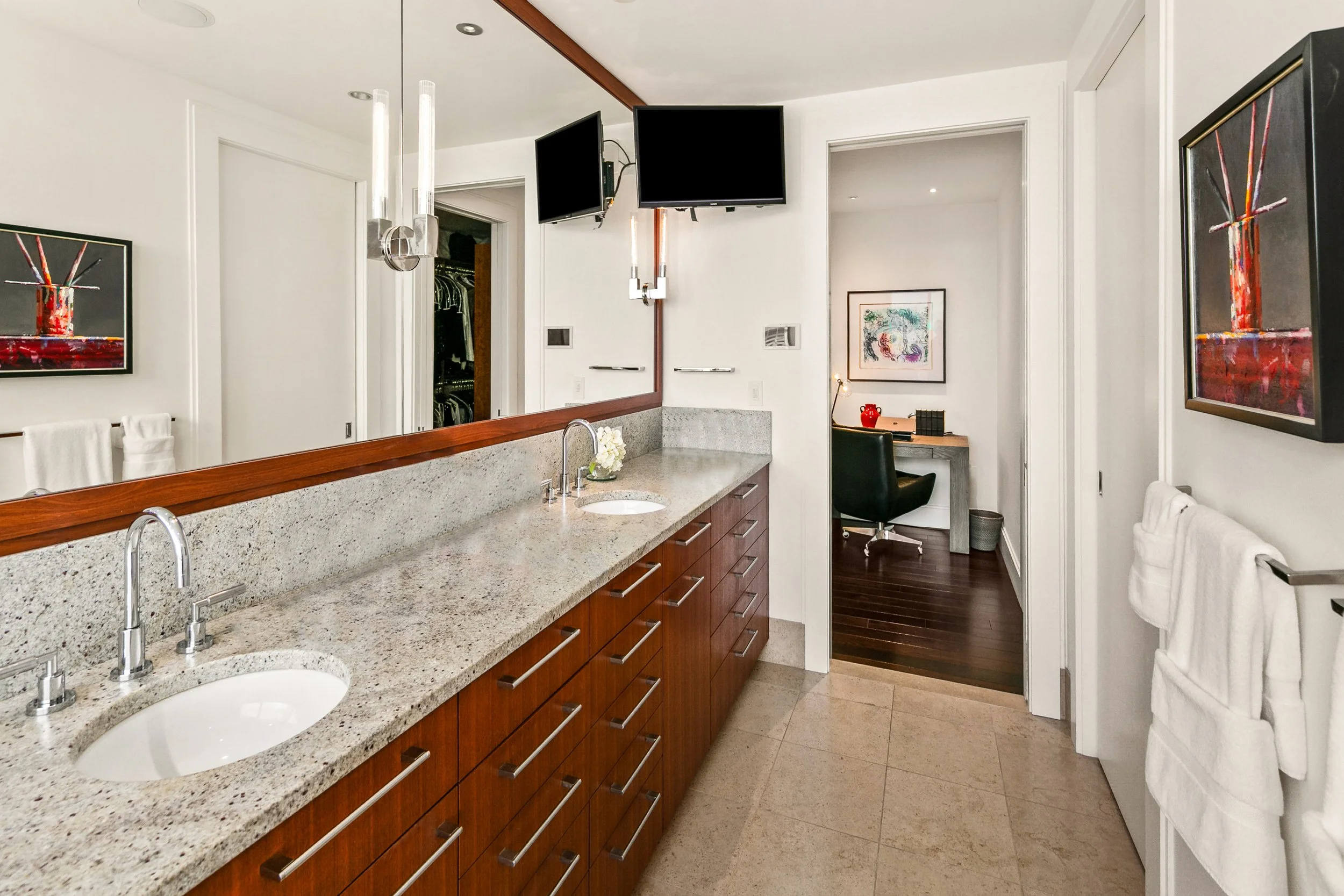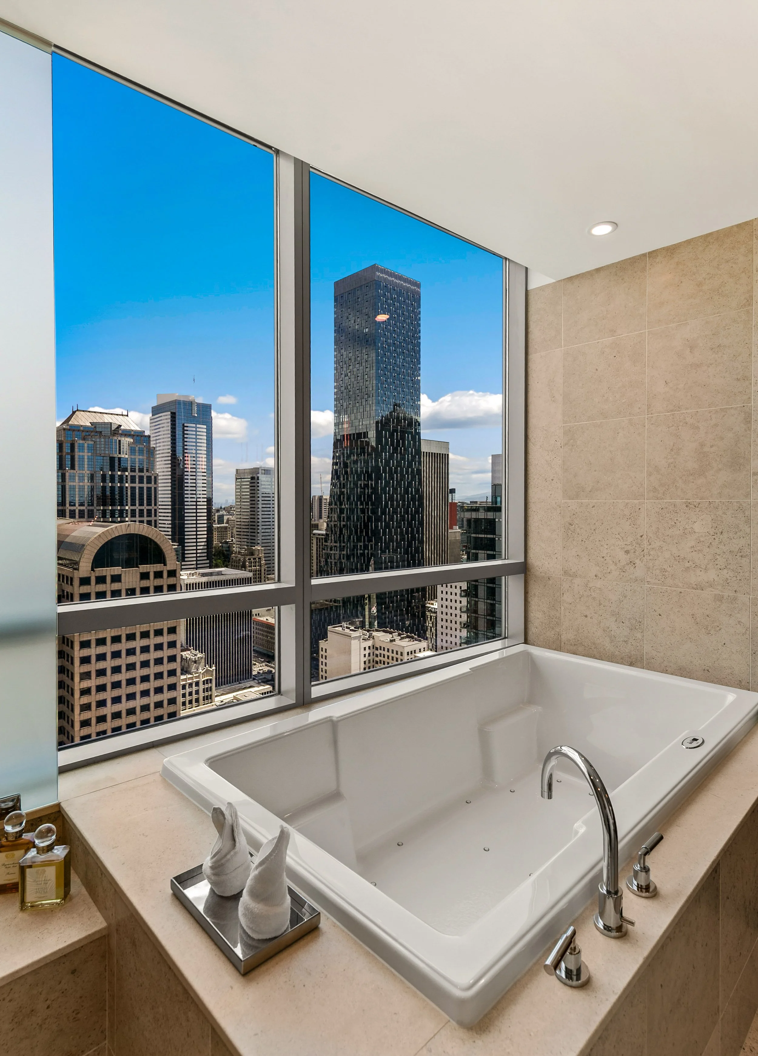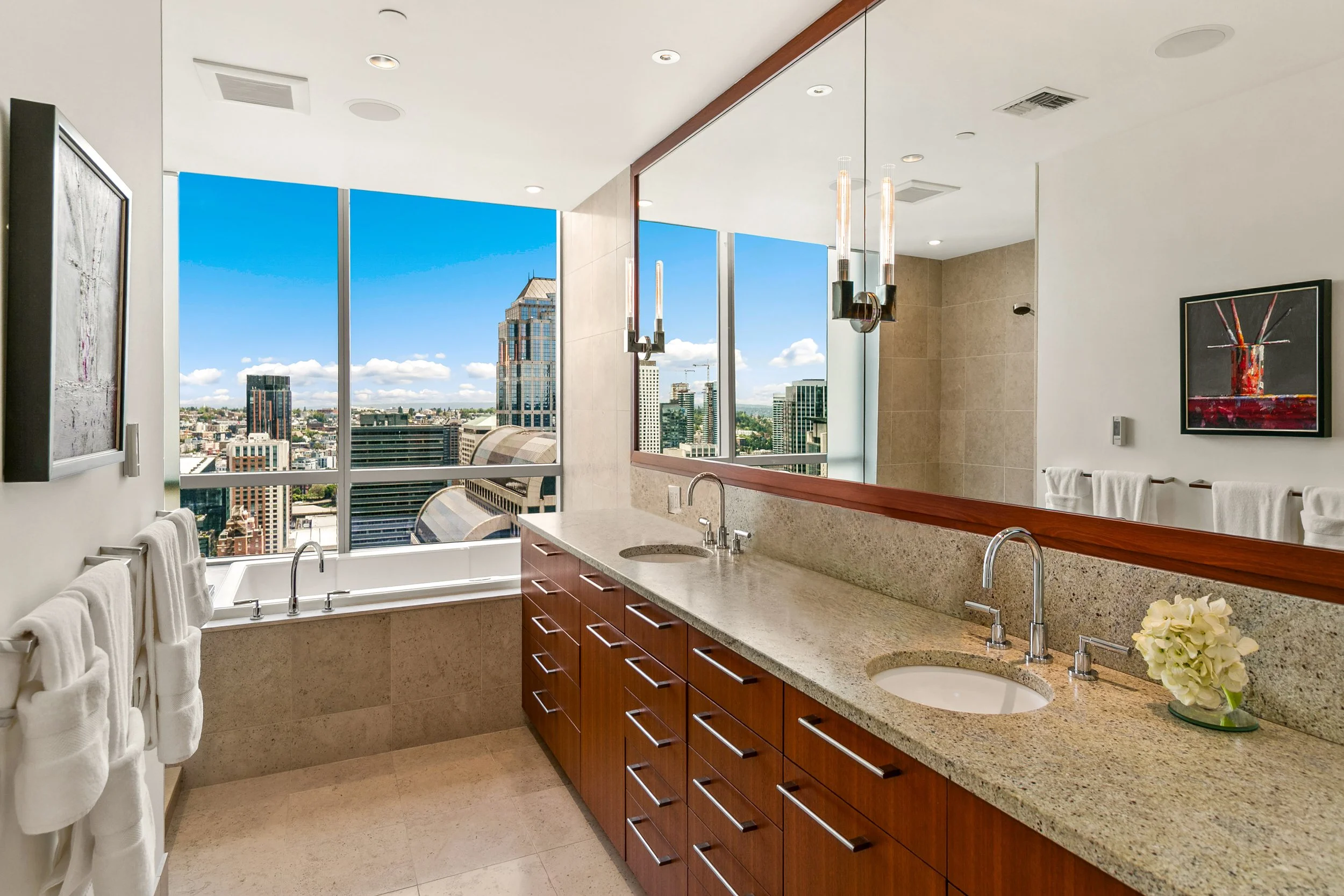 Both expansive primary suites offer sanctuary-like comfort, with full walls of glass capturing dazzling views of city lights and Elliott Bay’s calming waters. Spa-inspired five-piece bathrooms invite indulgence, featuring luxurious soaking tubs, dual vanities, spacious glass-enclosed showers, curated lighting, and exquisite finishes. Custom walk-in closets complete the picture of elevated daily living.